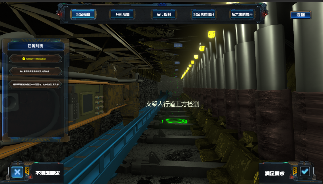 本系统有多种井下模拟实际操作,大类分五个:设备基础、采煤机训练、液压支架训练、多人联机、掘锚机模拟。种类多样可进行多种工种进行训练。