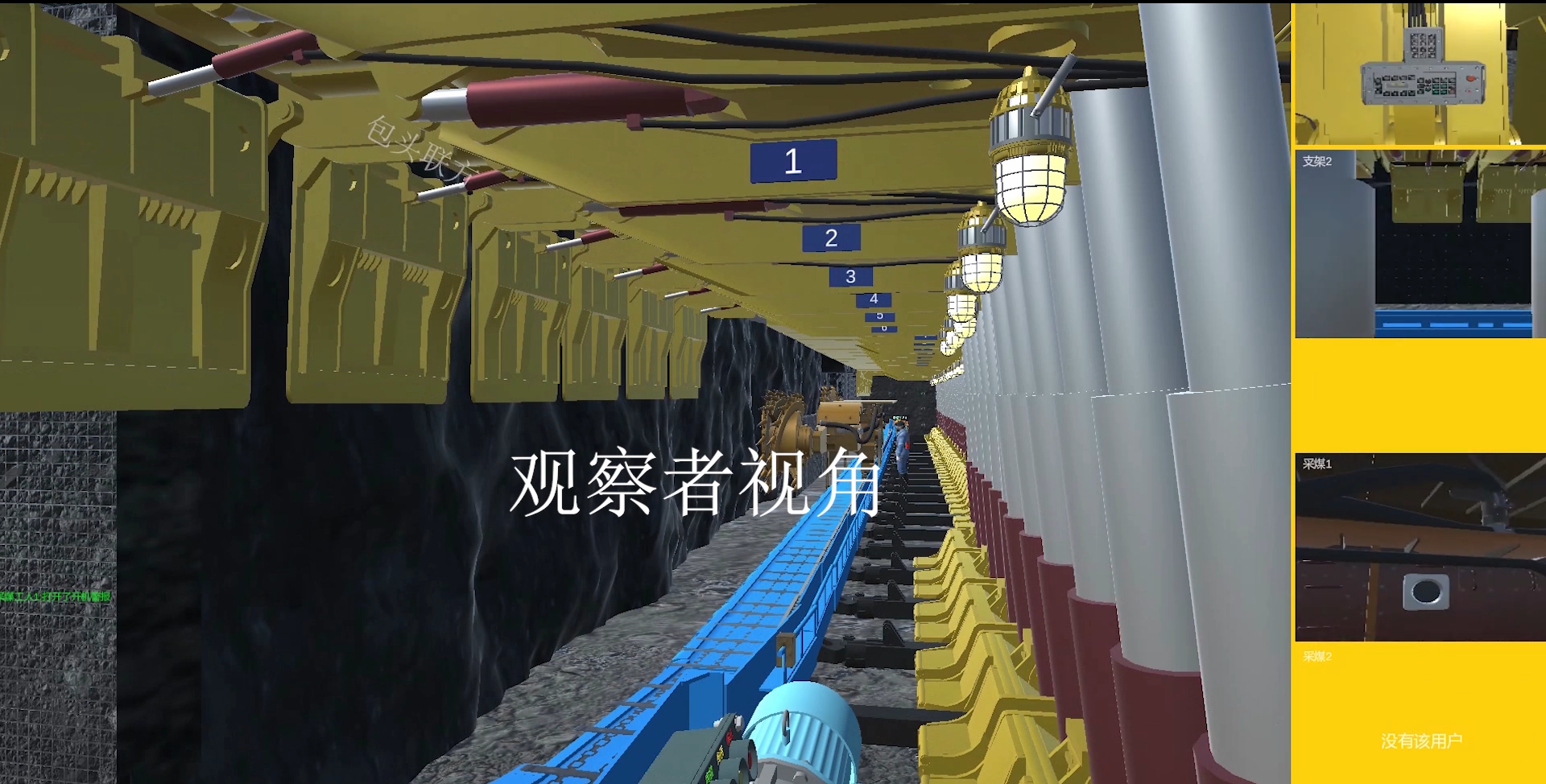 本系统可模拟多工种协同操作,有采煤机司机1、采煤机司机2、液压支架工1、液压支架工2和观察者等5种角色,其中观察者可随意走动,并可以看到所有人的视角以及操作。